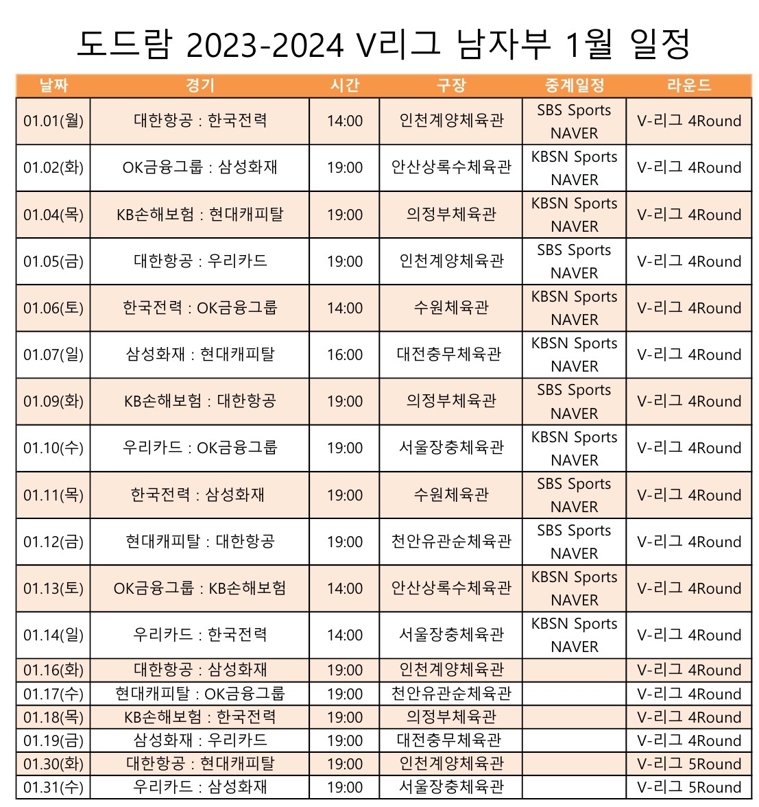 도드람 2023-2024 V리그 남자부 1월 일정