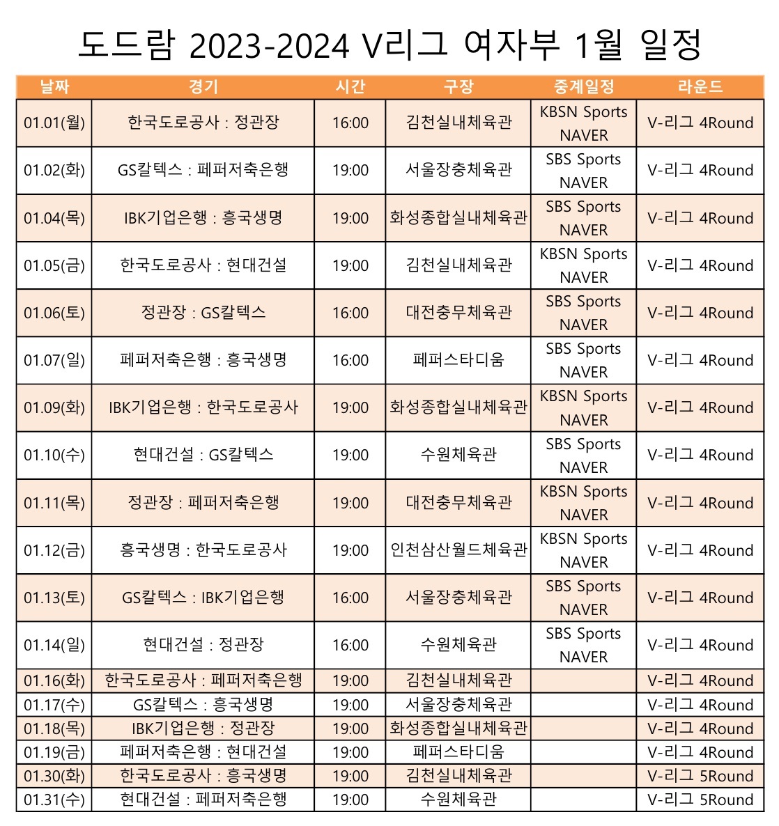 도드람 2023-2024 V리그 1월 일정입니다