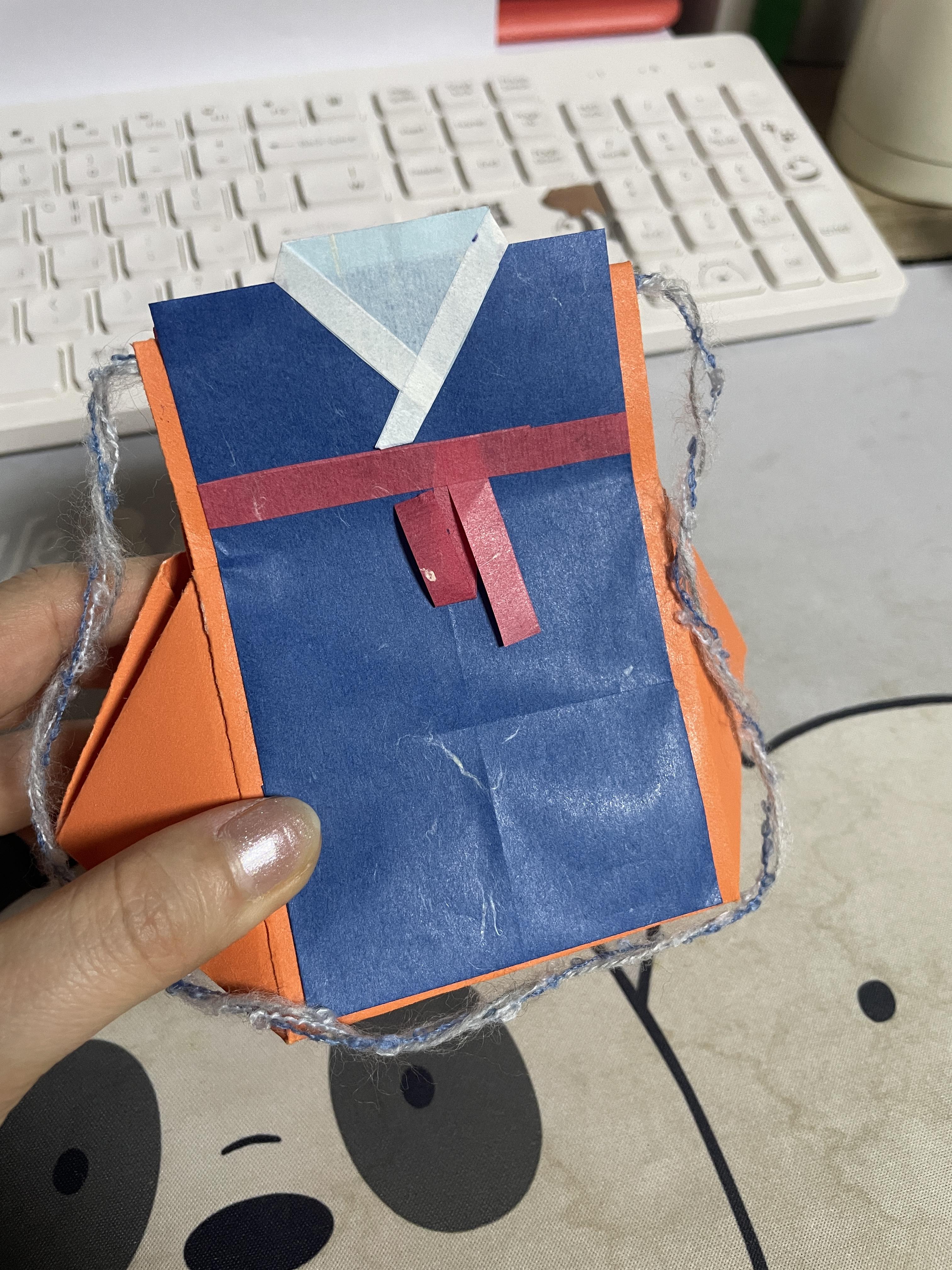 모양을 예쁘게 잡아주고 앞뒤로 여자 한복 저고리, 남자 한복 두루마기를 만들어서 붙여주면 완성~!