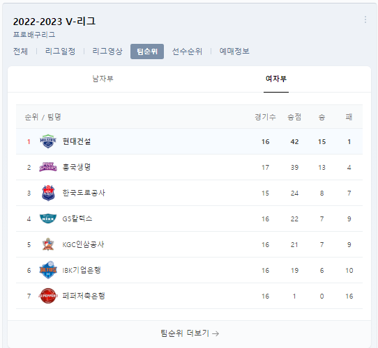 현재 여자부 리그는 현대건설이 1위를 차지하고 있는데요