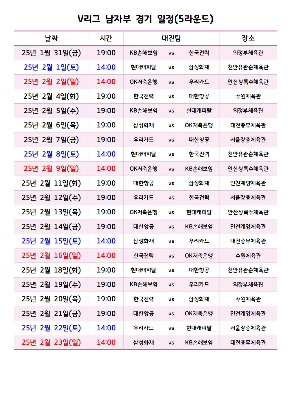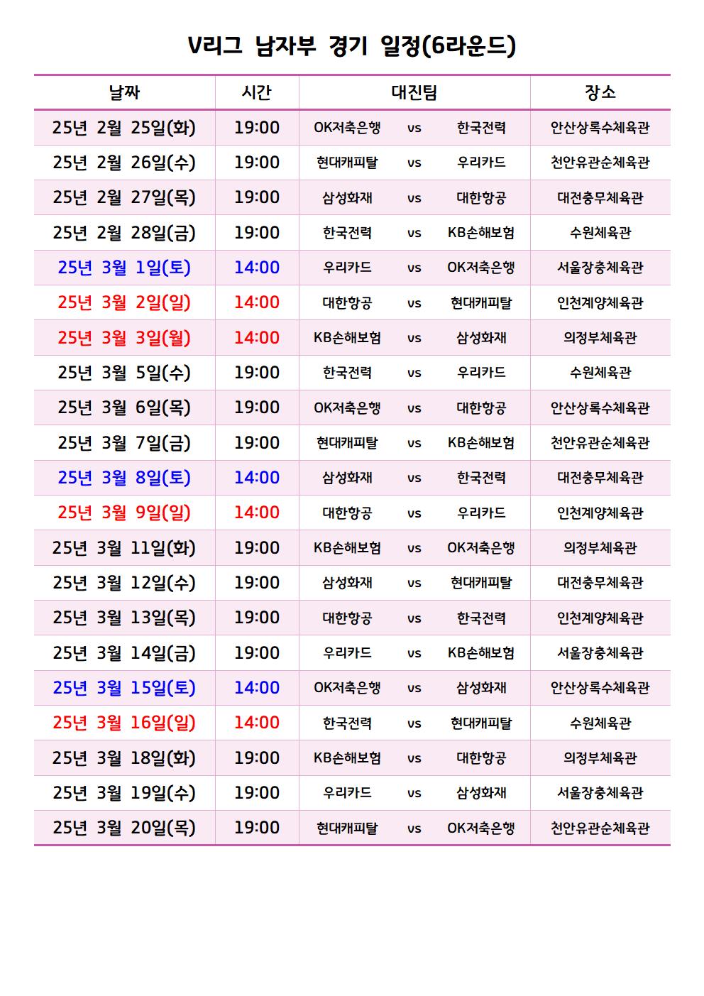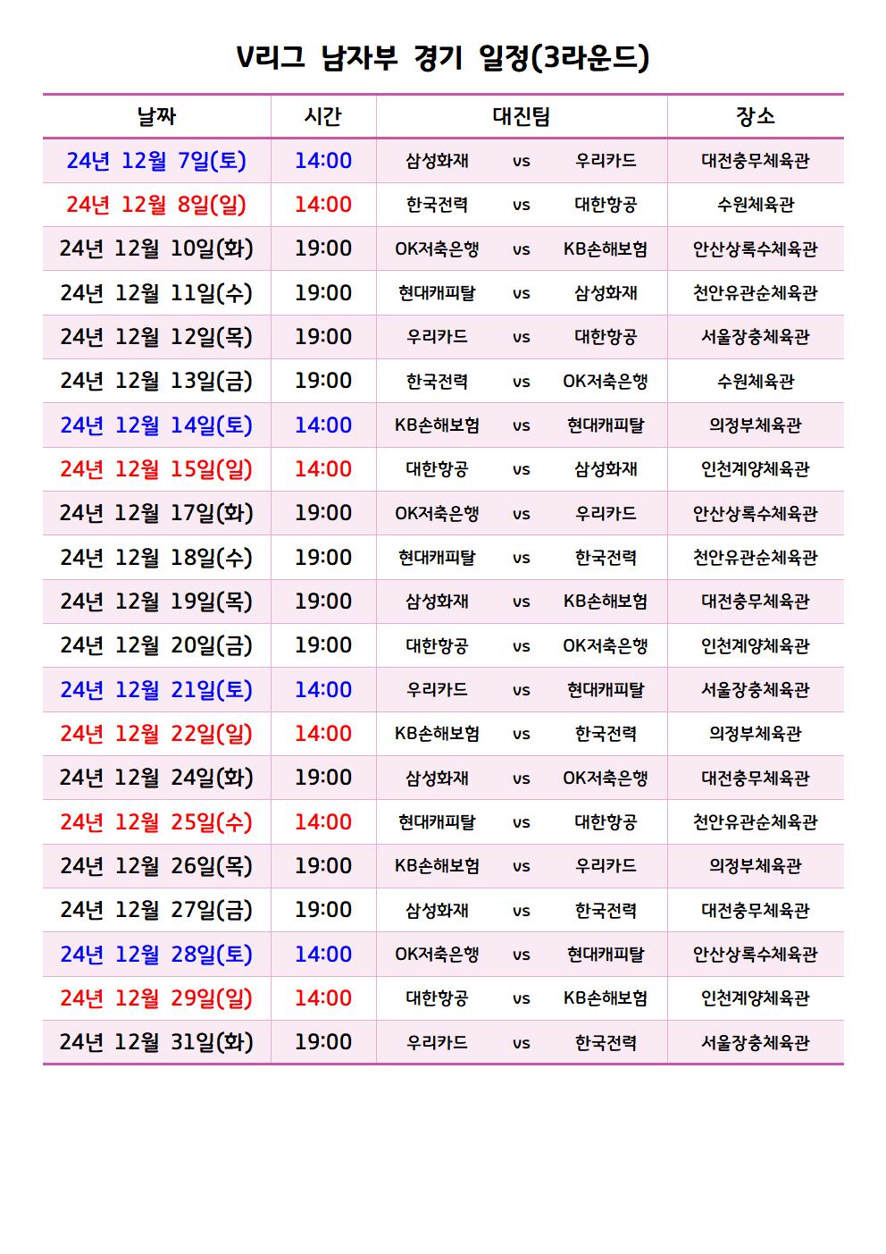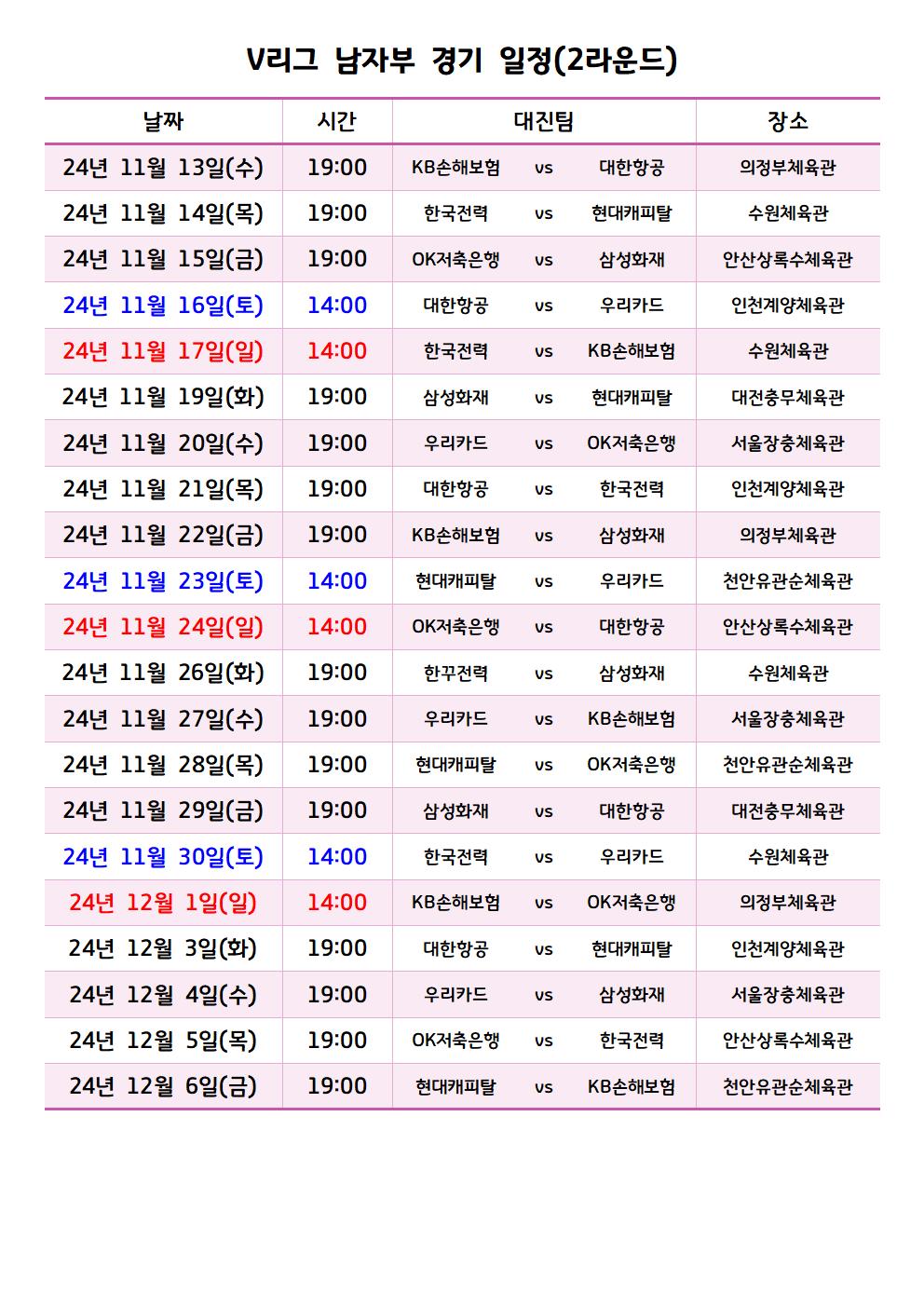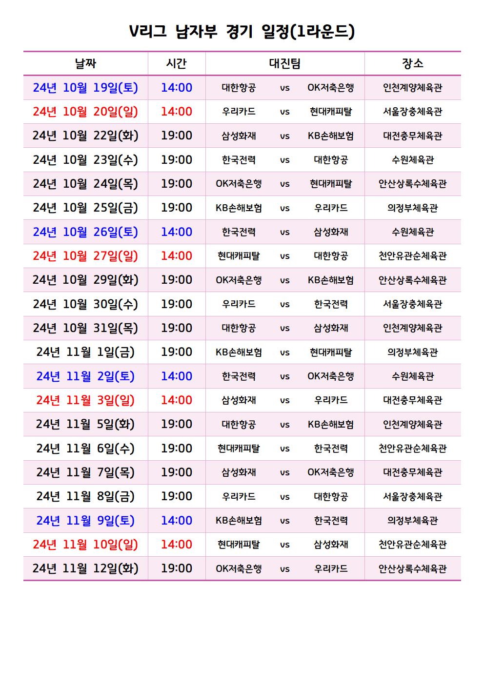 이번 포스트에서는 남자부 경기 일정들을 여자부와 마찬가지로