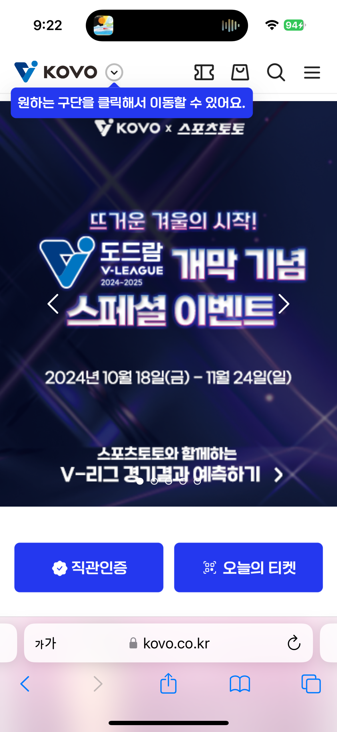 KOVO 홈페이지에 들어가면 바로 뜨는 배너 중에서