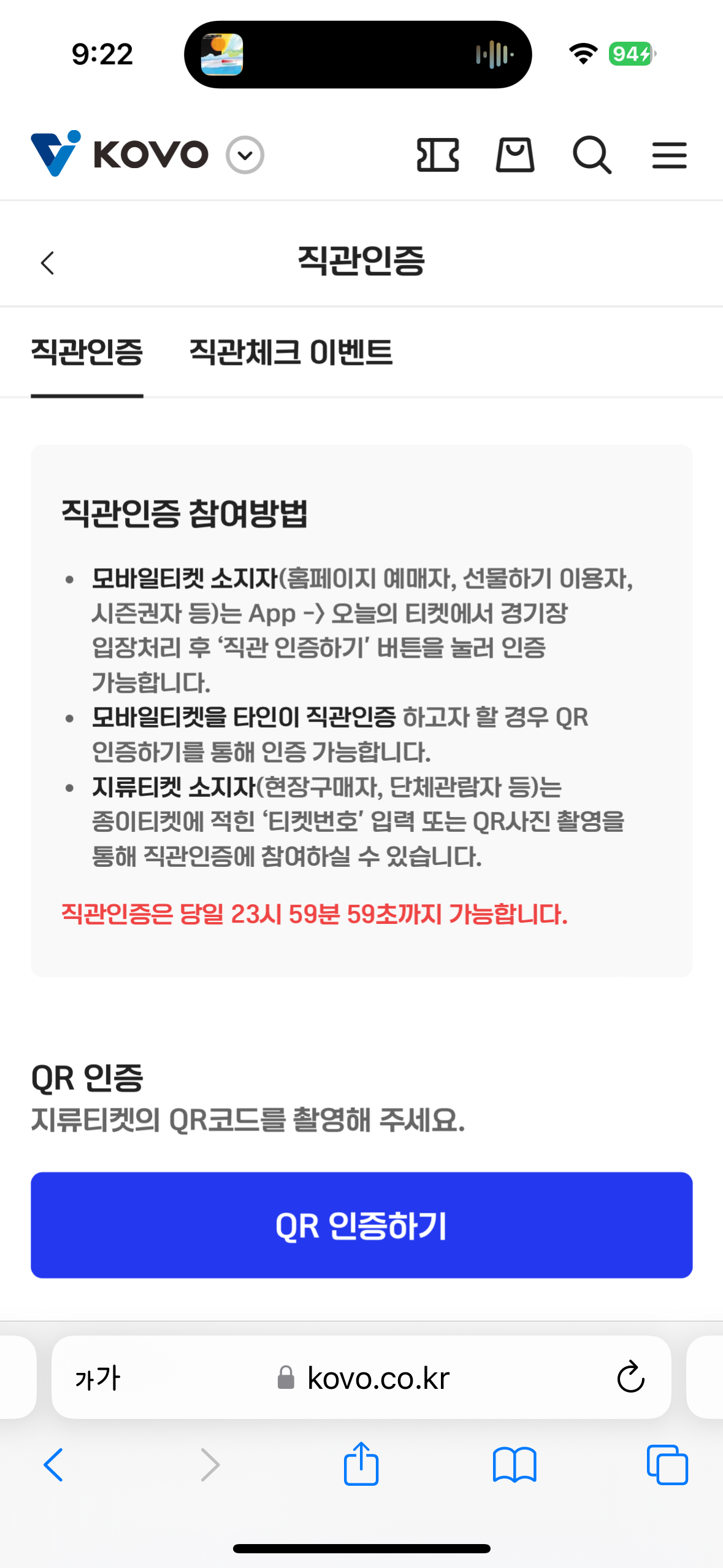 >>오늘의 티켓<< 으로 들어가시면 직관인증을 할 수 있습니다
