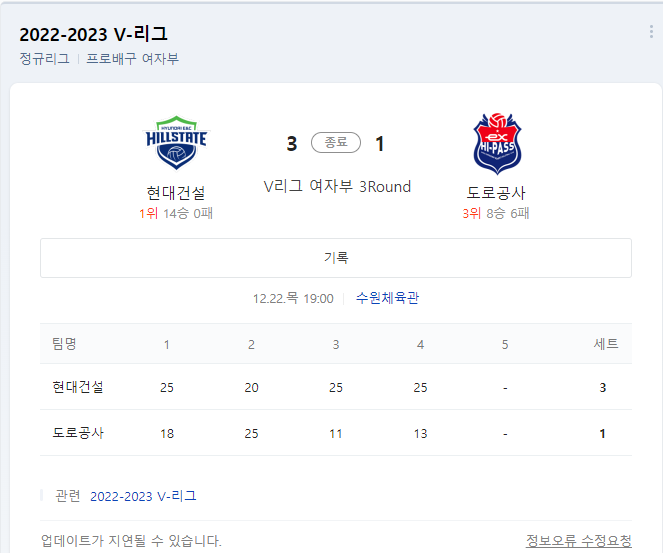 두 팀의 경기 기록은 3대 1로 현대건설이 차지했습니다