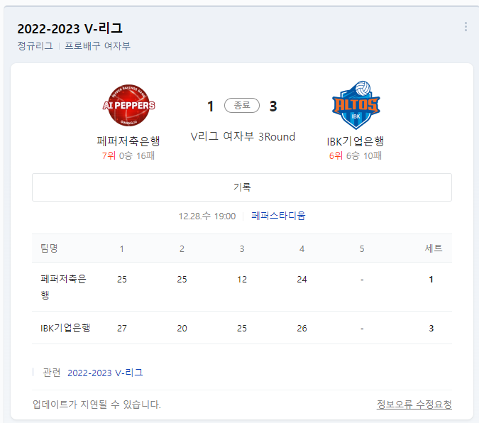 22.12.28 여자 프로배구 일정, 페퍼저축은행 vs IBK 기업은행 (0) | 2022.12.28 |
