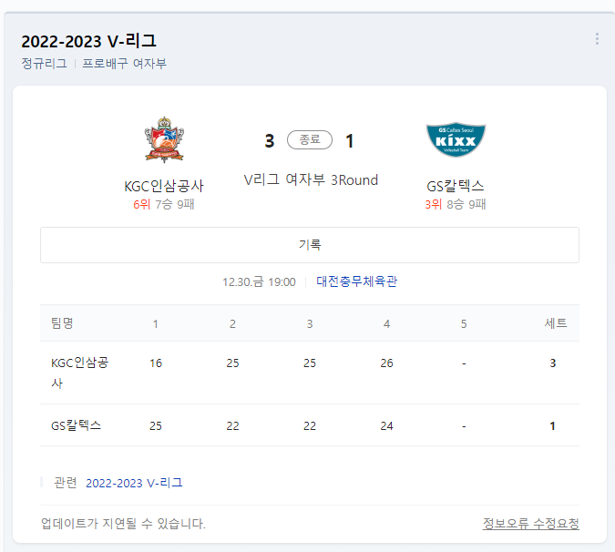 지난 30일 경기는 대전충무체육관에서 KGC 인삼공사와 GS칼텍스 간의 경기가 있었습니다