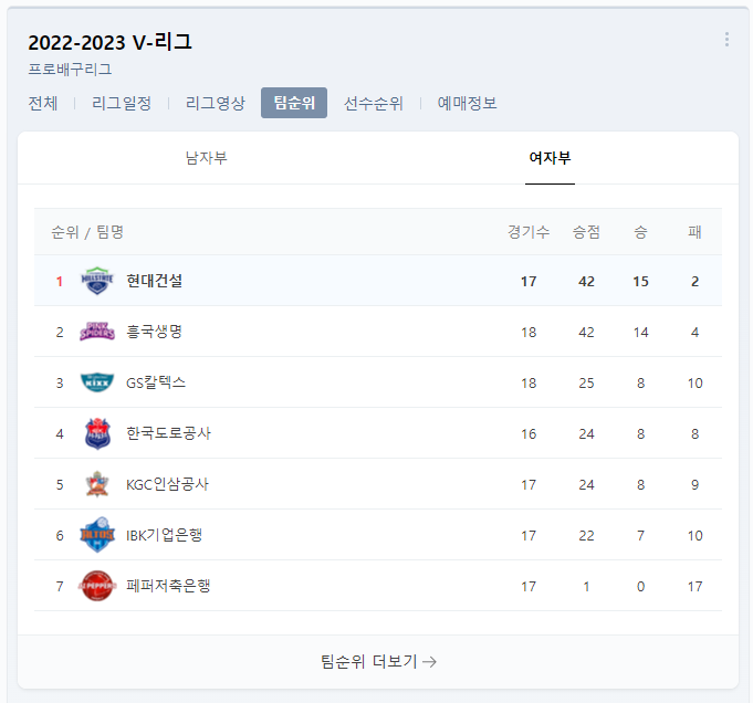 그로인해 1점차이였던 IBK 기업은행을 2점차로 따돌리며 순위를 앞지르게 되었네요