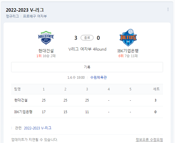 23.01.04 여자 프로배구 일정, 현대건설 vs IBK 기업은행 (0) | 2023.01.04 |