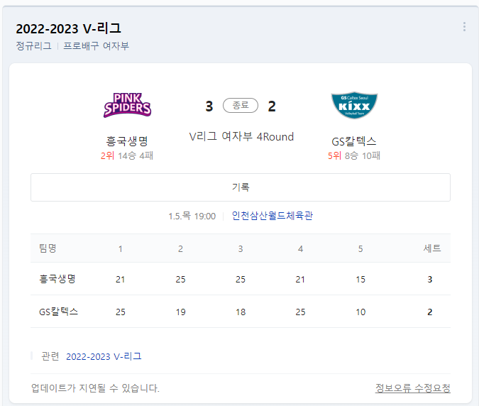 지난 5일은 인천삼산월드체육관에서 흥국생명과 GS칼텍스의 경기가 있었습니다