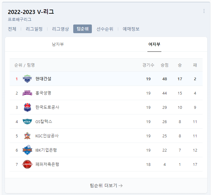 이로써 한국 도로공사는 중위권에서도 점수를 조금 벌려나가기 시작했습니다