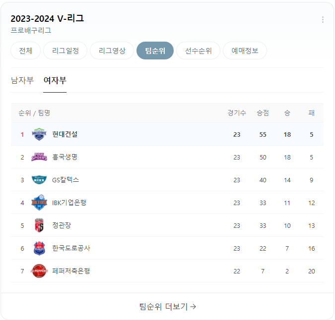 현대건설이 2위와의 5점 차이를 유지하며 1위를 지켜나가고 있는 모습이 보이네요