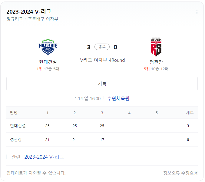 지난 14일은 수원체육관에서 현대건설과 정관장의 경기가 있었습니다