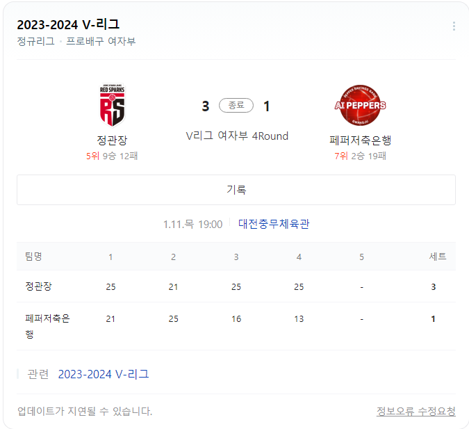 | 24.01.11 오늘의 여자 배구 일정, 정관장 vs 페퍼저축은행 (0) | 2024.01.11 |