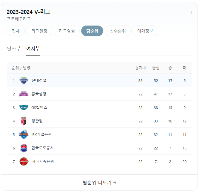 IBK기업은행과 점수차가 얼마 나지 않은 상황이라 4,5위 순위 싸움이 좀 더 치열해질 것 같네요