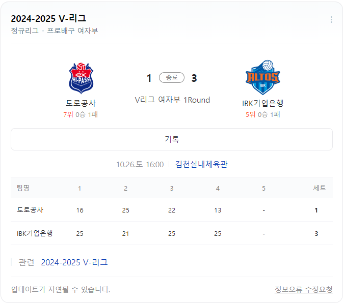 지난 26일은 김천실내체육관에서 한국도로공사와 IBK기업은행의 경기가 있었습니다