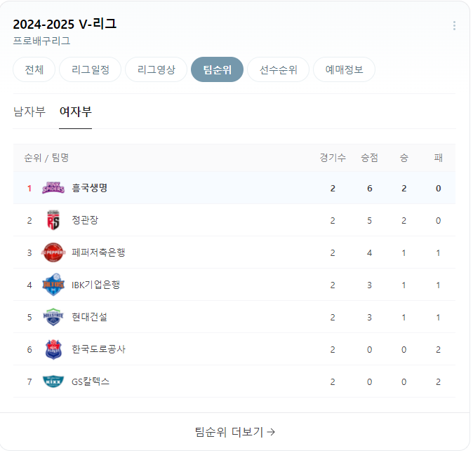 현재 경기를 2번씩 치르며 한국도로공사와 GS칼텍스를 제외하곤 모두 승점을 획득한 상태입니다