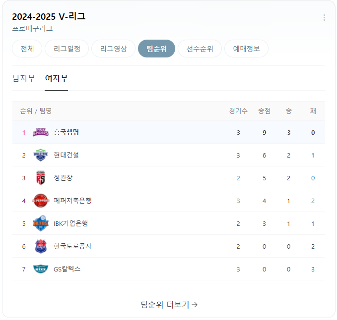 팀 종합 순위 외 득점, 공격 등 다양한 팀 기록이 궁금하시면 KOVO 통합 사이트에서 확인 가능합니다