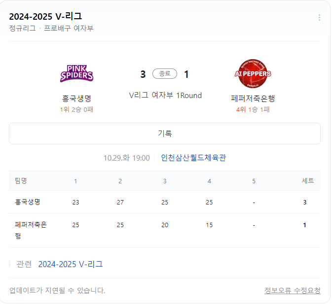 | 24.10.29 오늘의 여자배구 일정, 흥국생명 vs 페퍼저축은행 (1) | 2024.10.29 |