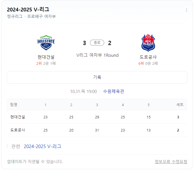 | 24.10.31 오늘의 여자배구 일정, 현대건설 vs 한국도로공사 (1) | 2024.10.31 |