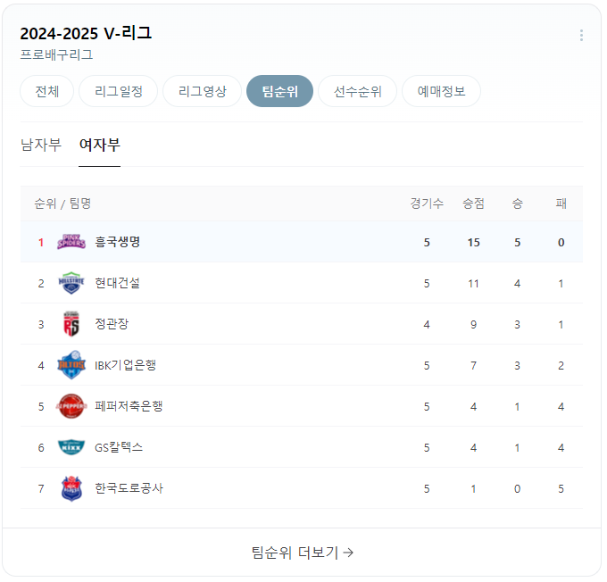 팀 종합 순위 외 득점, 공격 등 다양한 팀 기록이 궁금하시면 KOVO 통합 사이트에서 확인 가능합니다