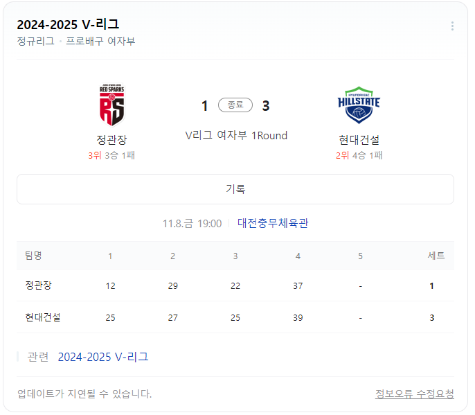 결과는 39점으로 현대건설이 승리하며 정관장은 아쉽게 승리를 내주게 되었습니다