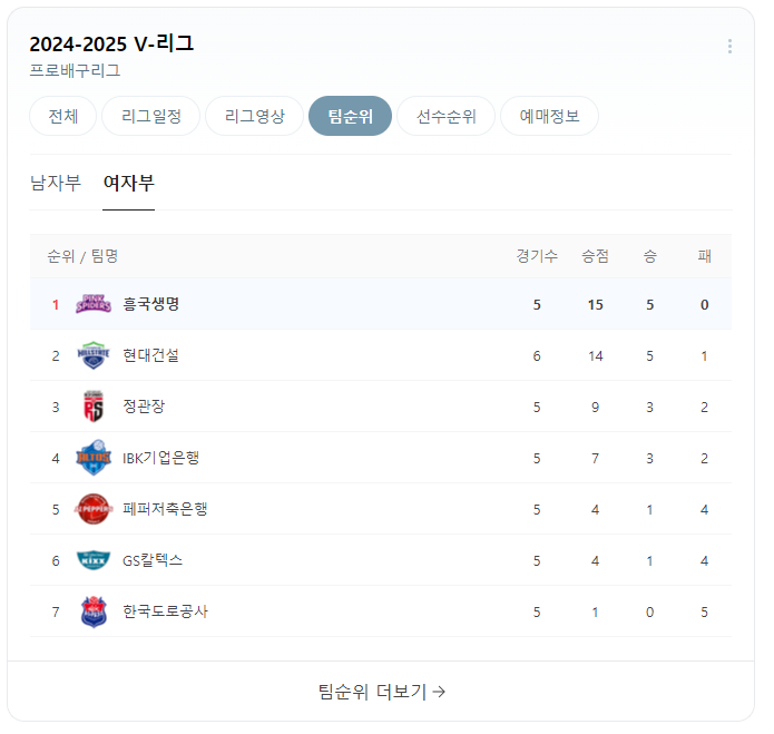 팀 종합 순위 외 득점, 공격 등 다양한 팀 기록이 궁금하시면 KOVO 통합 사이트에서 확인 가능합니다