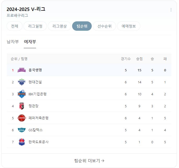 팀 종합 순위 외 득점, 공격 등 다양한 팀 기록이 궁금하시면 KOVO 통합 사이트에서 확인 가능합니다