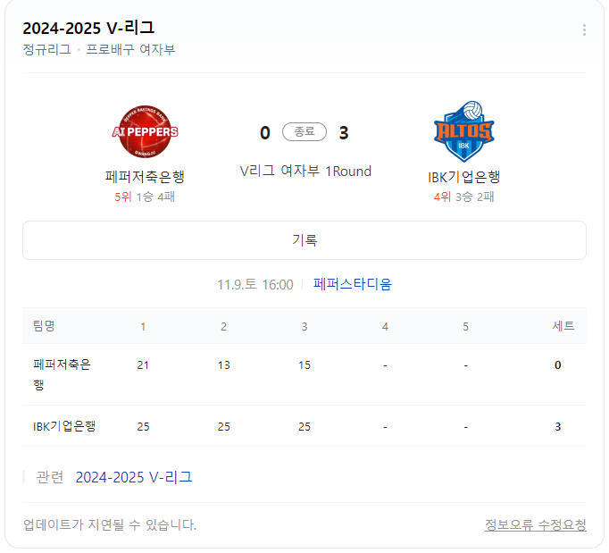 이로서 페퍼저축은행은 연패 기록을 이어가는 모습을 보이고 IBK 기업은행은 연승을 달성하게 되었습니다