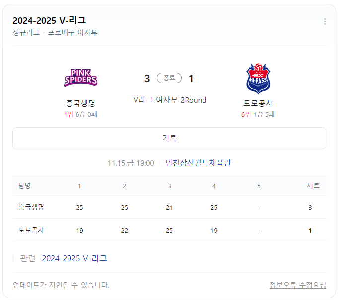 지난 15일은 인천삼산월드체육관에서 흥국생명과 한국도로공사의 경기가 있었습니다