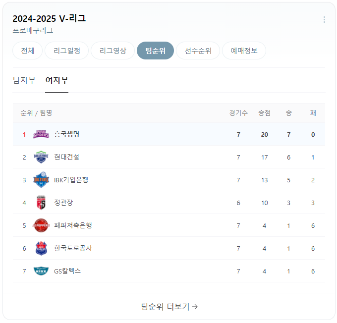 팀 종합 순위 외 득점, 공격 등 다양한 팀 기록이 궁금하시면 KOVO 통합 사이트에서 확인 가능합니다