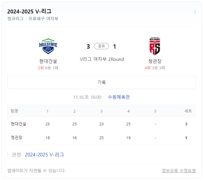 | 24.11.16 오늘의 여자배구 일정, 현대건설 vs 정관장 (1) | 2024.11.16 |