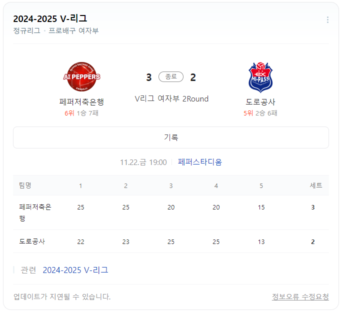 결과는 3대 2로 페퍼저축은행이 이겼습니다
