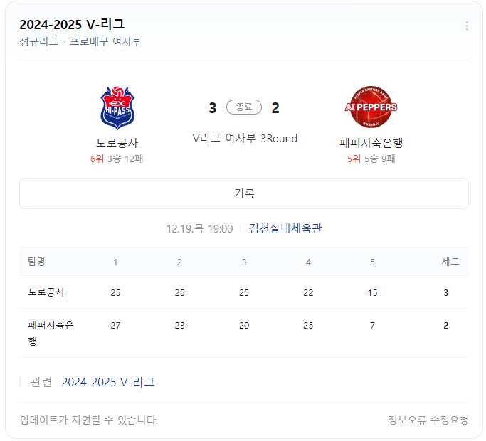24.12.19 오늘의 여자배구 일정, 한국도로공사 vs 페퍼저축은행 (0) | 2024.12.19 |